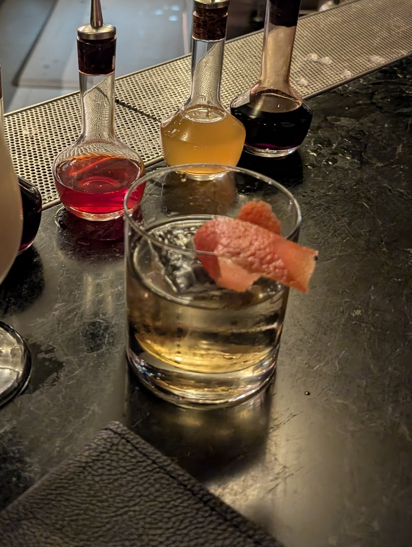 Replica cocktail imitiating the Lobby Bar in SF, where I visited 2025-08-22 for Fedge’s live musical debut. The concept of a tequila old fashioned isn’t new, but I adored this particular rendition.